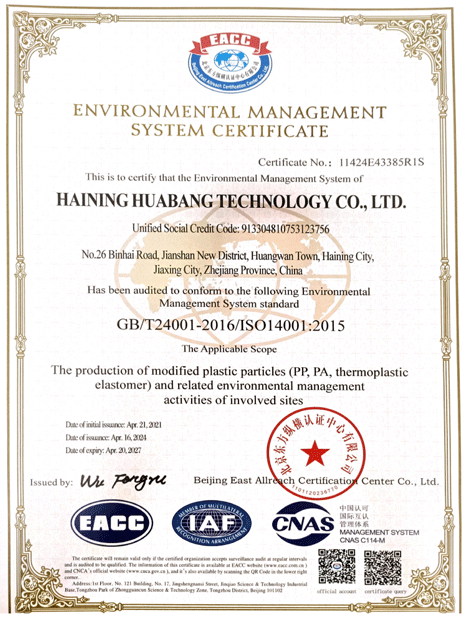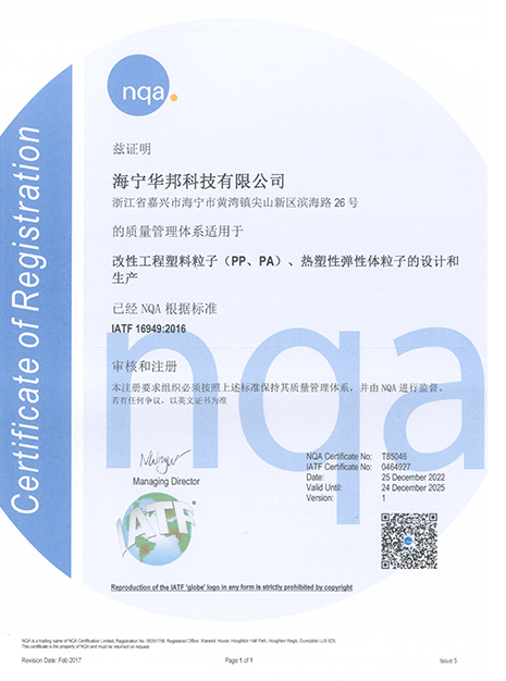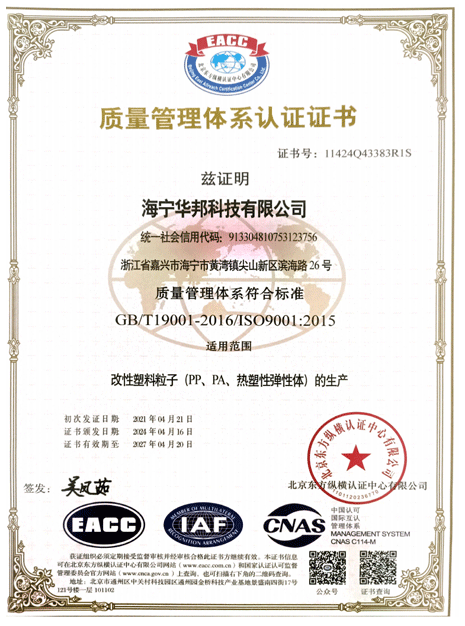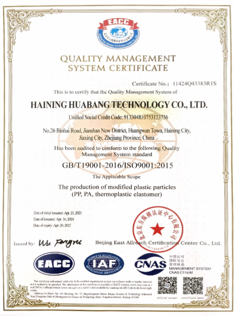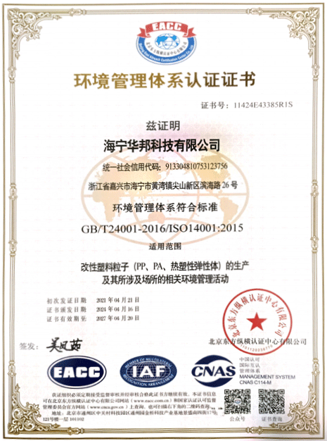 海宁华邦科技有限公司成立于2013年,是一家专门从事研发、生产和销售改性塑料材料的企业,公司地处浙江省嘉兴市海宁市黄湾镇尖山新区滨海路26号,距市区 20公里,位于钱塘江边,紧靠G15嘉绍高速,邻近上海、苏州、杭州、宁波等地,交通十分便利。